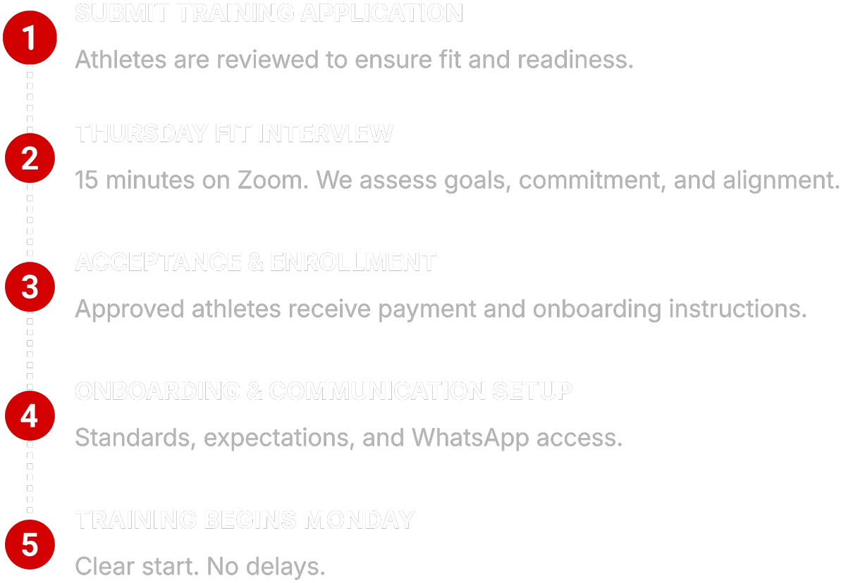We accept a limited number of athletes to protect training quality, focus, and results. Admission is selective to ensure every athlete meets our standards and gets the level of coaching this program demands.